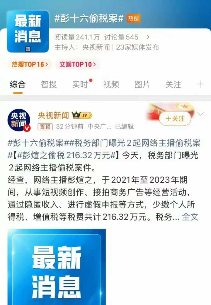网红彭十六偷税