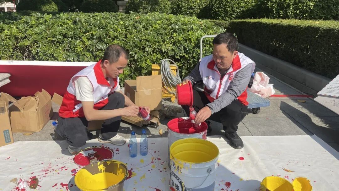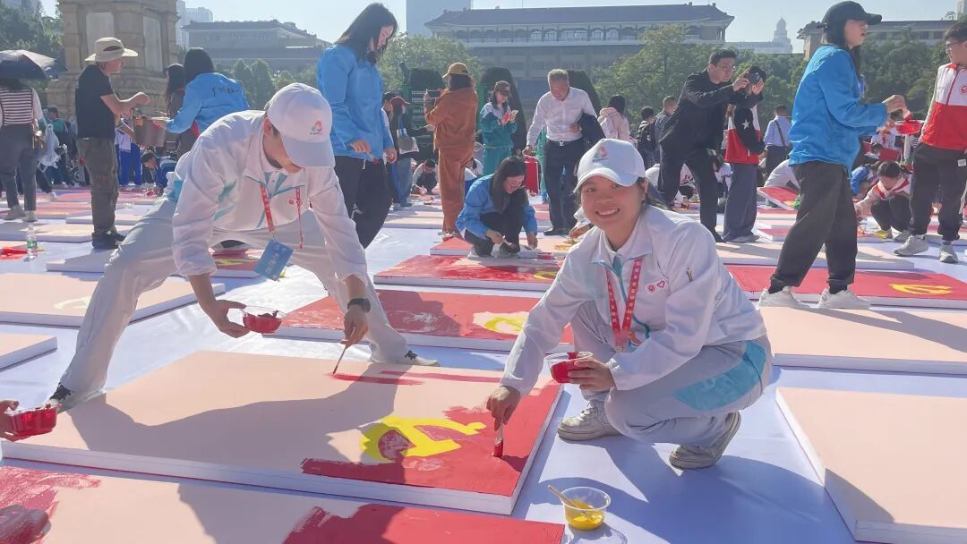 在“千人共绘旗帜”环节,学生、家长、嘉宾与志愿者共同参与,将一块块红色画板拼接成巨幅五星红旗。烈日下,汗水浸湿衣衫,颜料染红双手,但当国旗完整铺展在广场上时,现场爆发出热烈掌声。