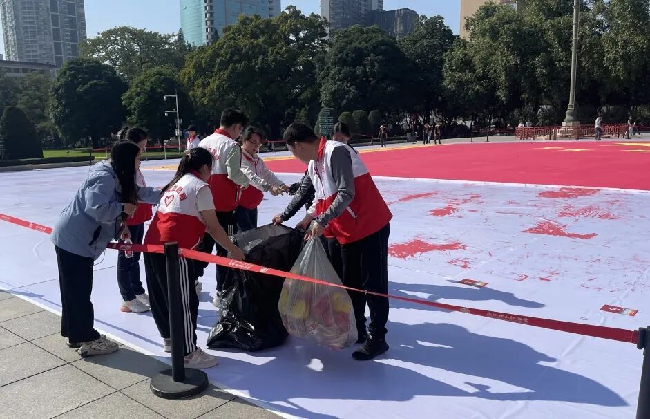 在这幅国旗背后,是高度协同的志愿服务力量:后勤组搬运板材、方阵组引导学生、机动组配合流程……正如志愿者李彩玉所说——“单独看我们很普通,但连在一起,就能成就震撼人心的画面。”