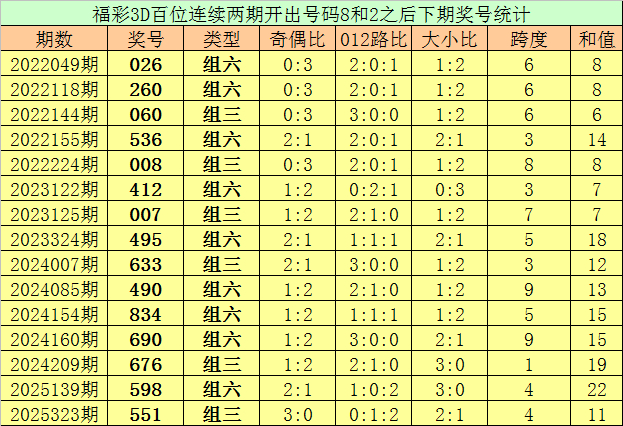 百位号码:连续两期百位出号分别为:8-2,历史上福彩3D连续两期前后分别出号8-2的奖号共出现88次。在百位8-2的奖号现象出现时,近15期下期分别出号:026-260-060-536-008-412-007-495-633-490-834-690-676-598-551;