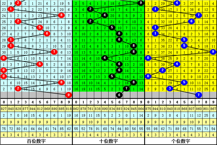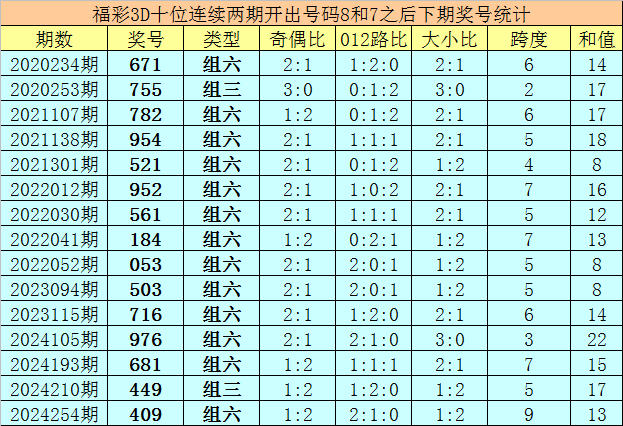 十位号码:前两期十位分别出现奖号8-7,历史上福彩3D连续前后分别开出号码8-7的现象共开出96次。在十位8-7的现象出现时,最近15期其下期分别开出号码:671-755-782-954-521-952-561-184-053-503-716-976-681-449-409;