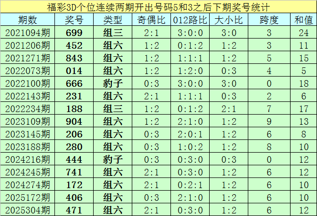 个位号码:最近两期个位开出号码为5-3,在福彩3D历史开奖中,前后两期个位分别开出号码5-3的奖号出现了85次。最近15期个位5-3组合出现之后,其下期奖号分别为:699-452-843-014-666-231-188-904-206-280-444-741-172-406-471;